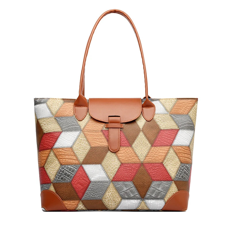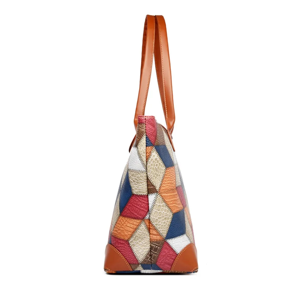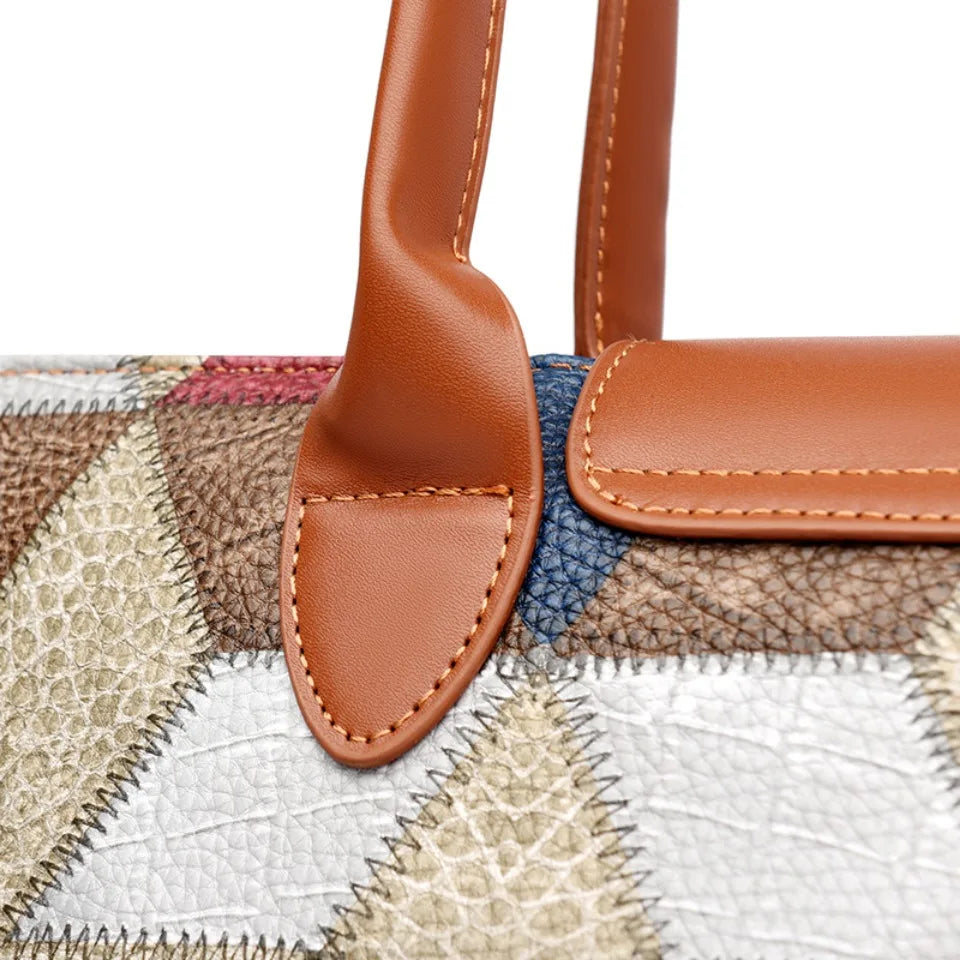 Made from high-quality synthetic leather, Leather Tote Bag comes with a patchwork design and a top handle.